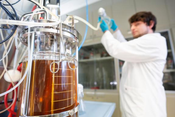 Mikroorganismen sind lebende Chemiefabriken. Aus einfachsten Zutaten erzeugen Bakterien und Pilze in kürzester Zeit hochkomplizierte Substanzen, die wir als Arzneistoffe, Kosmetika, Lösungsmittel, oder für die Herstellung unserer Lebensmittel nutzen. Als ein Nebenprodukt des bakteriellen Stoffwechsels kann dabei auch Elektrizität entstehen. Im Biotechnikum entwickeln wir neue Verfahren, um den Mikroben die gewünschten Stoffe in möglichst großer Ausbeute zu entlocken.